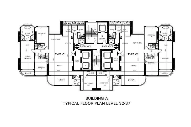 Tower A offers a variety of unit types, starting with 2-bedroom units sized 112 sq.m. (A1/A2) facing East, and 3-bedroom units sized 143 sq.m. (B1/B2) facing West. Each of these four units is equipped with its own private lift for exclusive access. The 4-bedroom units, sized 252 sq.m. (C1/C2), are positioned on the North–South wings of the tower, with each unit enjoying two private lifts for maximum comfort and exclusivity. The top floor is reserved for penthouses, each spanning 462 sq.m. across the entire floor, limited to only two residences.