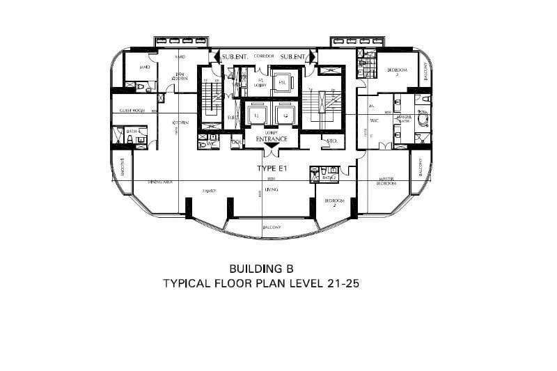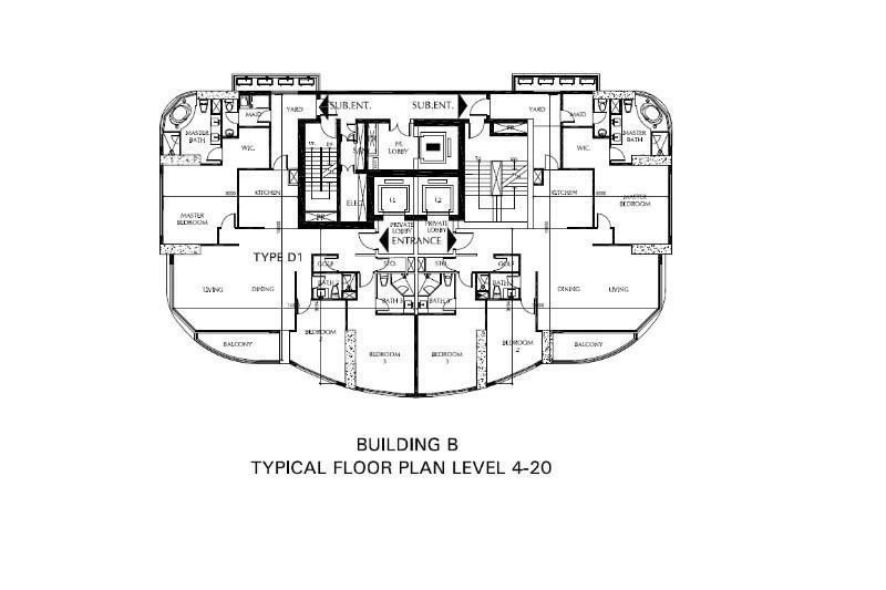 Tower B is designed with an emphasis on exclusivity, offering only 3-bedroom units sized 176–178 sq.m. and 4-bedroom units sized 356 sq.m. The 4-bedroom residences are essentially full-floor penthouses, each with two dedicated private lifts and expansive balconies facing West to capture stunning city views. At the rear, residents can access the corridor that connects to service lifts, fire exits, and a designated maintenance/service area. The 3-bedroom units are arranged by splitting the floor into North–South wings, each with its own private lift, delivering both luxury and functional living.